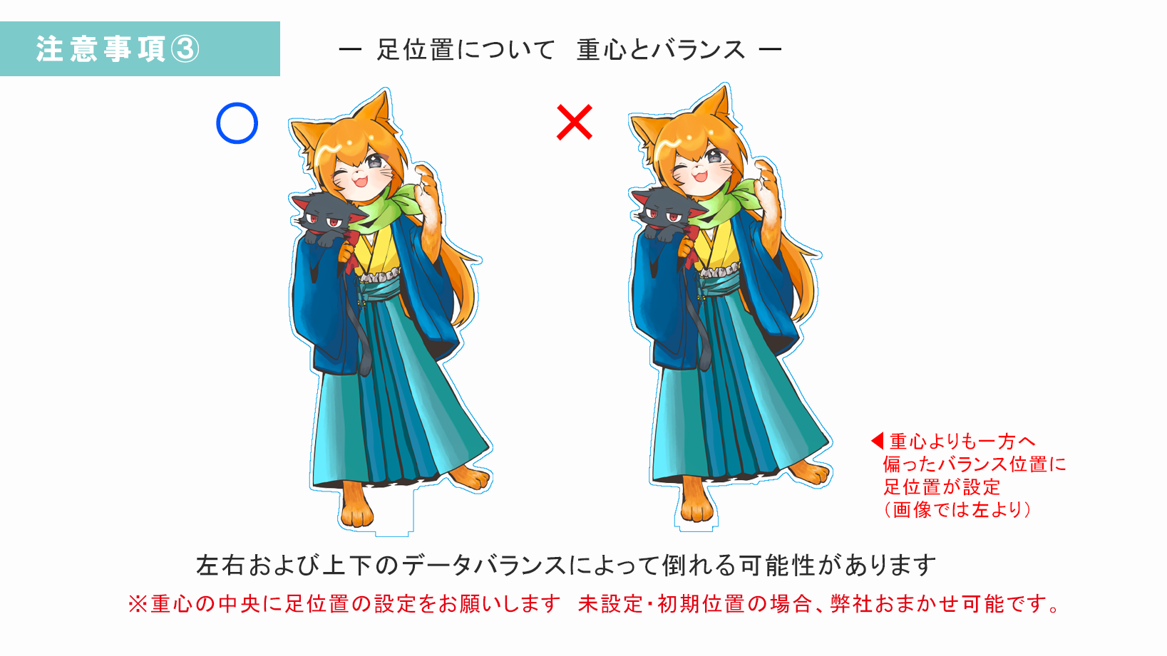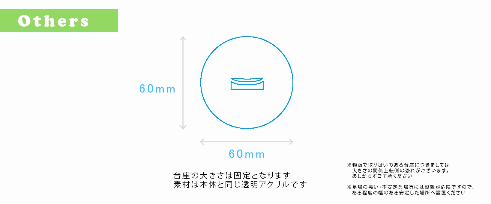 台座について:物販で取り扱いのある透明台座・異形台座・カラー台座・PESPO台座については転倒の可能性もございますので、付属の大台座をご利用ください。